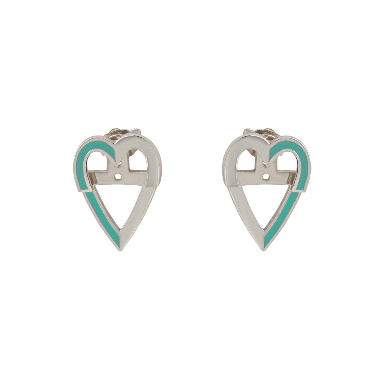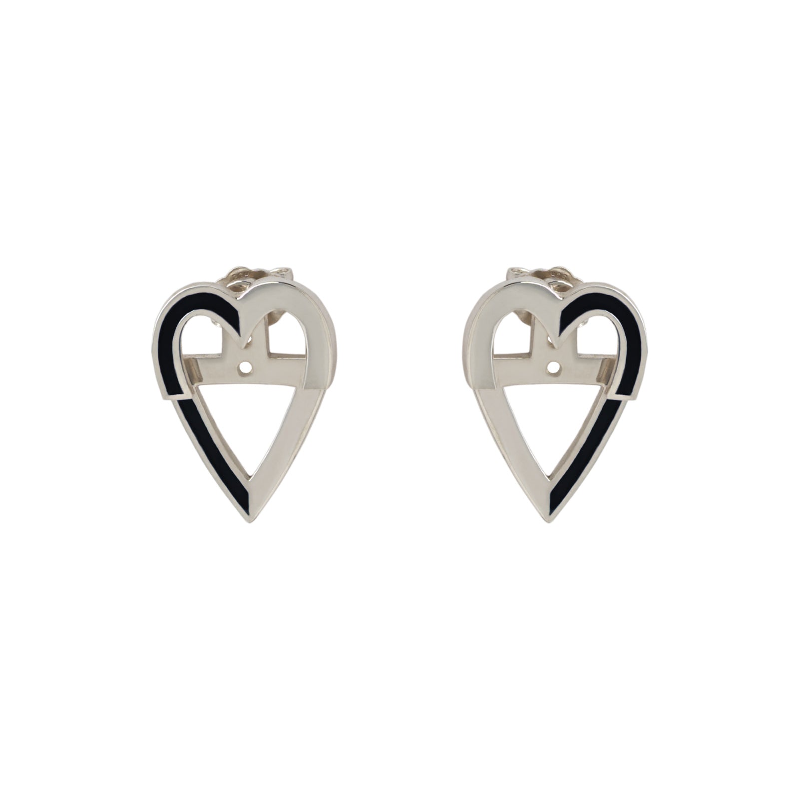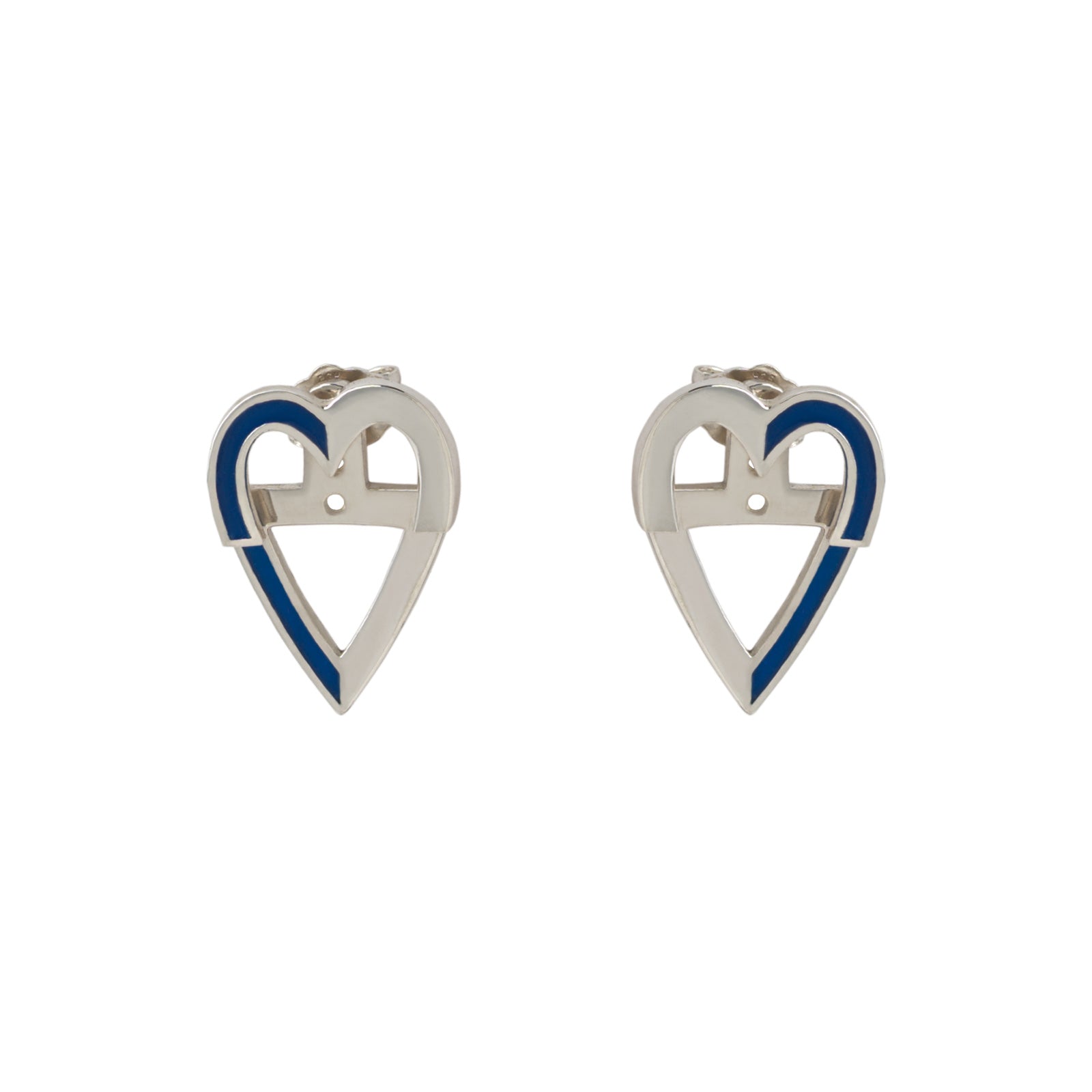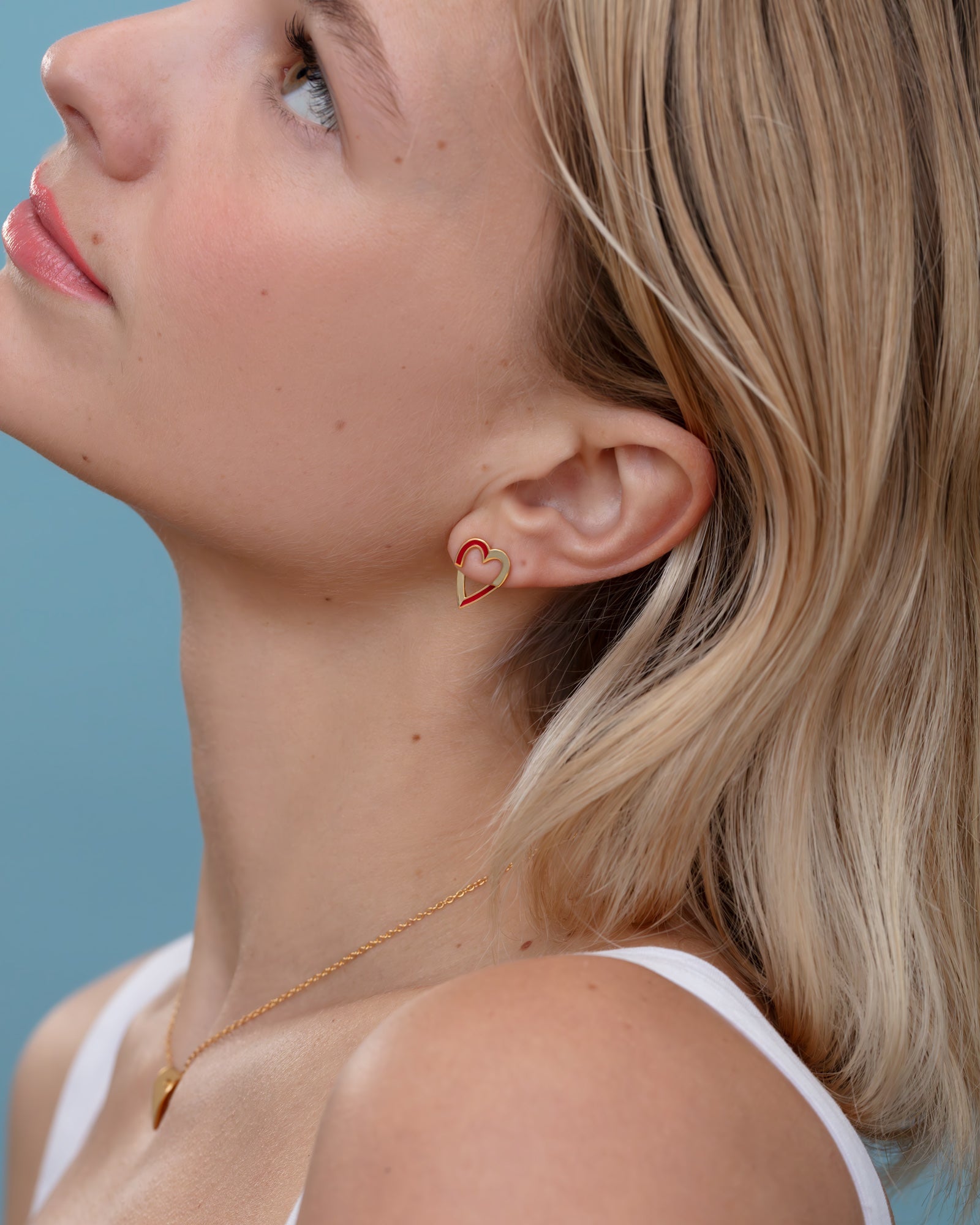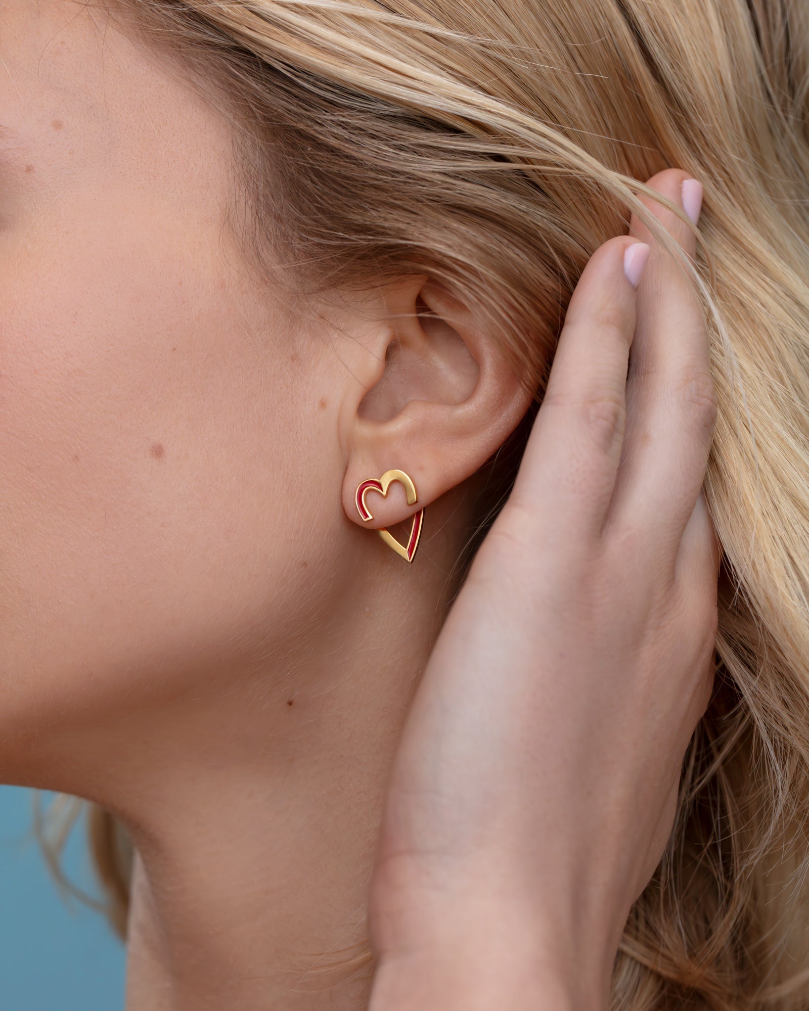The heart ear jackets are so fun and versatile to wear! They are made up of two complementary parts that goes in front and behind your ear lobe, held by a ear backing. Each heart is split into two vertically so you can play with either aligning the enamel of the back part to the one of front part or you can mismatch them for a dashed line effect like pictured on the model. The enamel also draws a heart around your face when you have a half heart drawn on each side of your face.