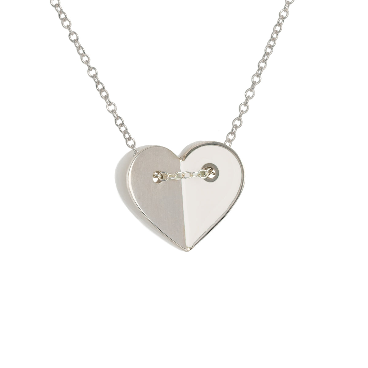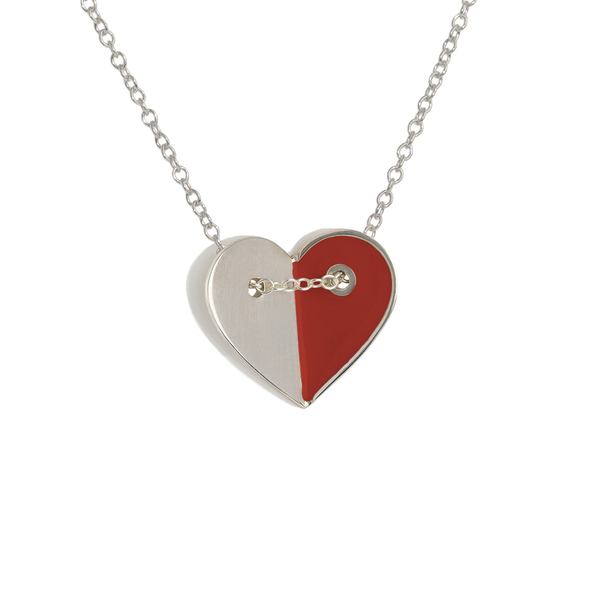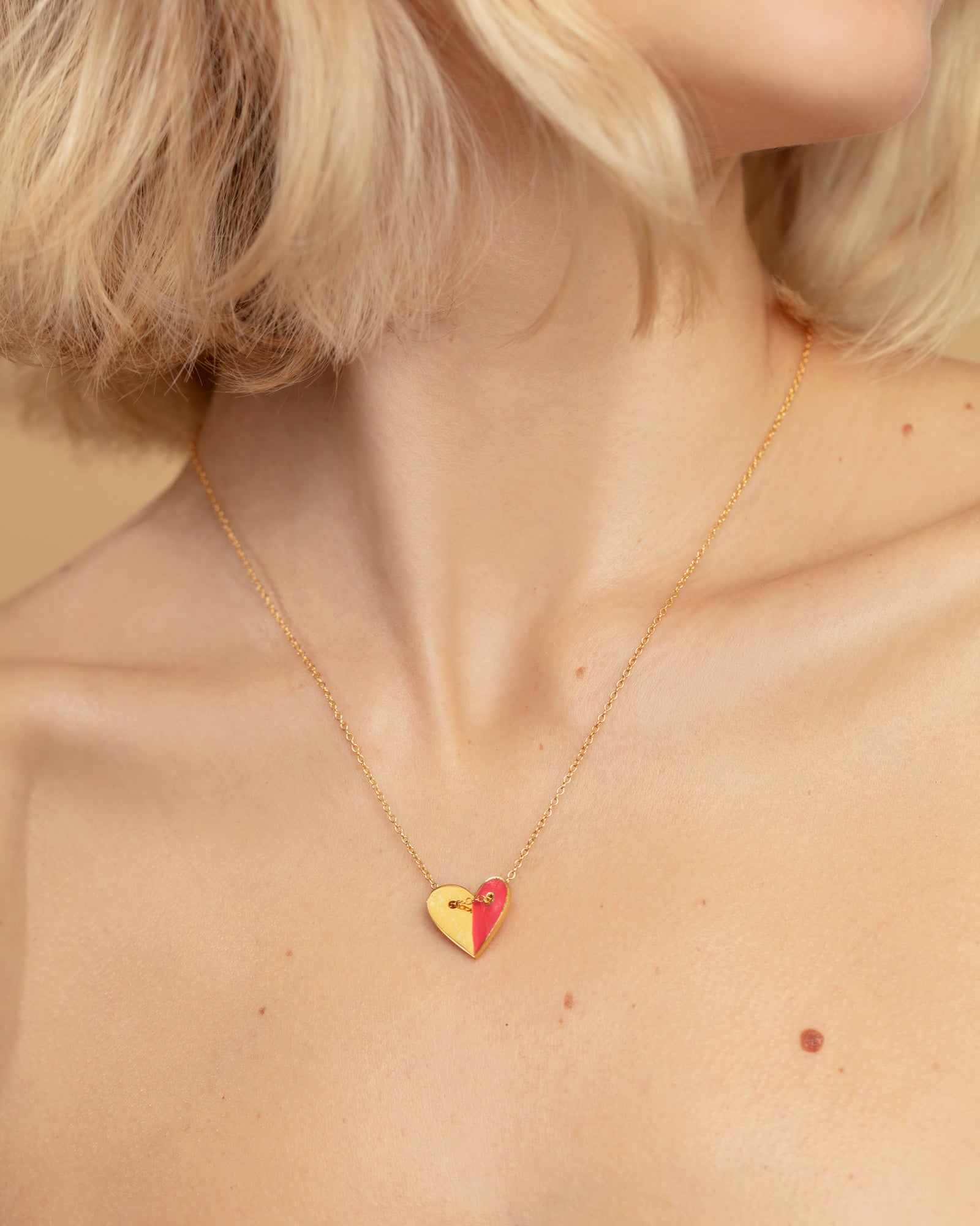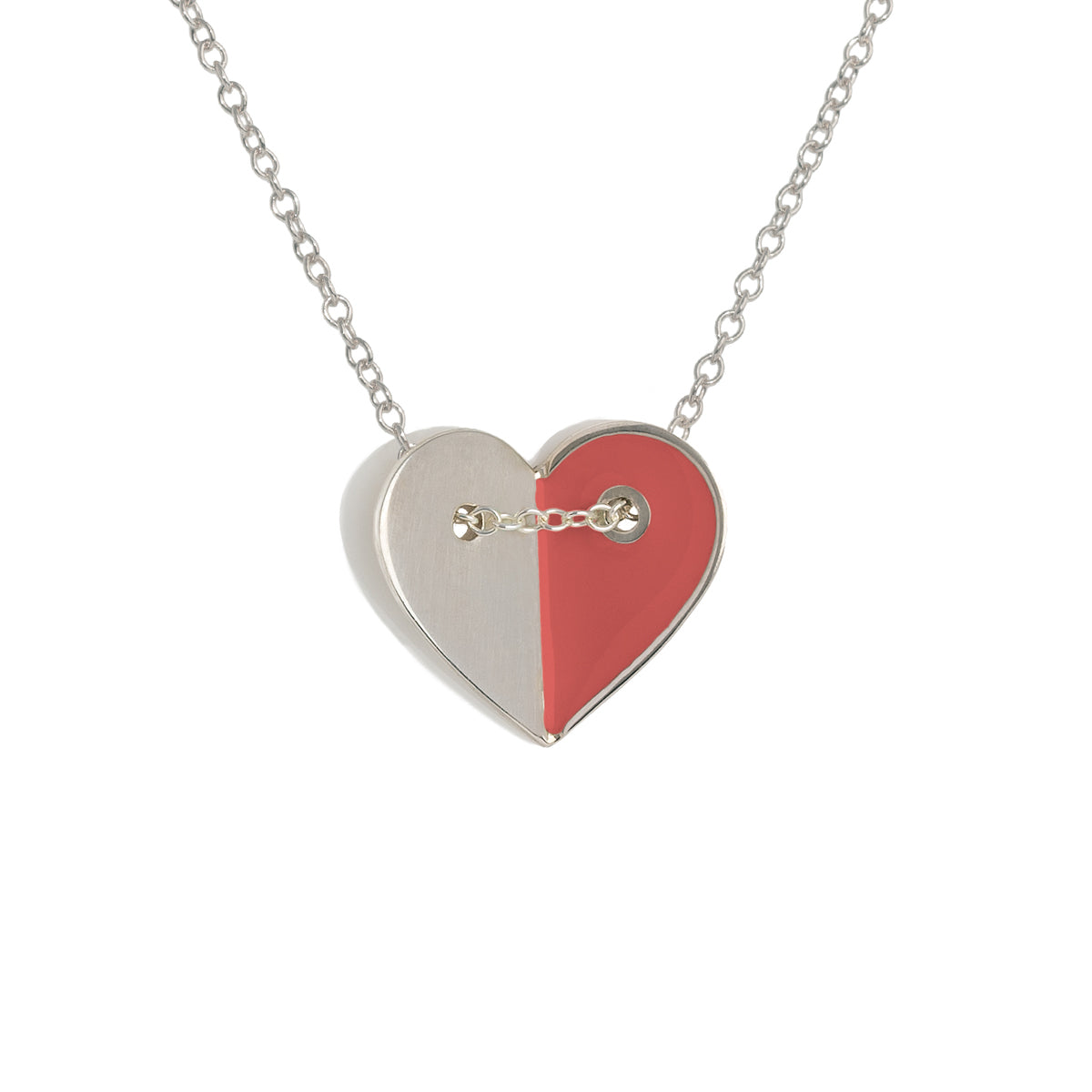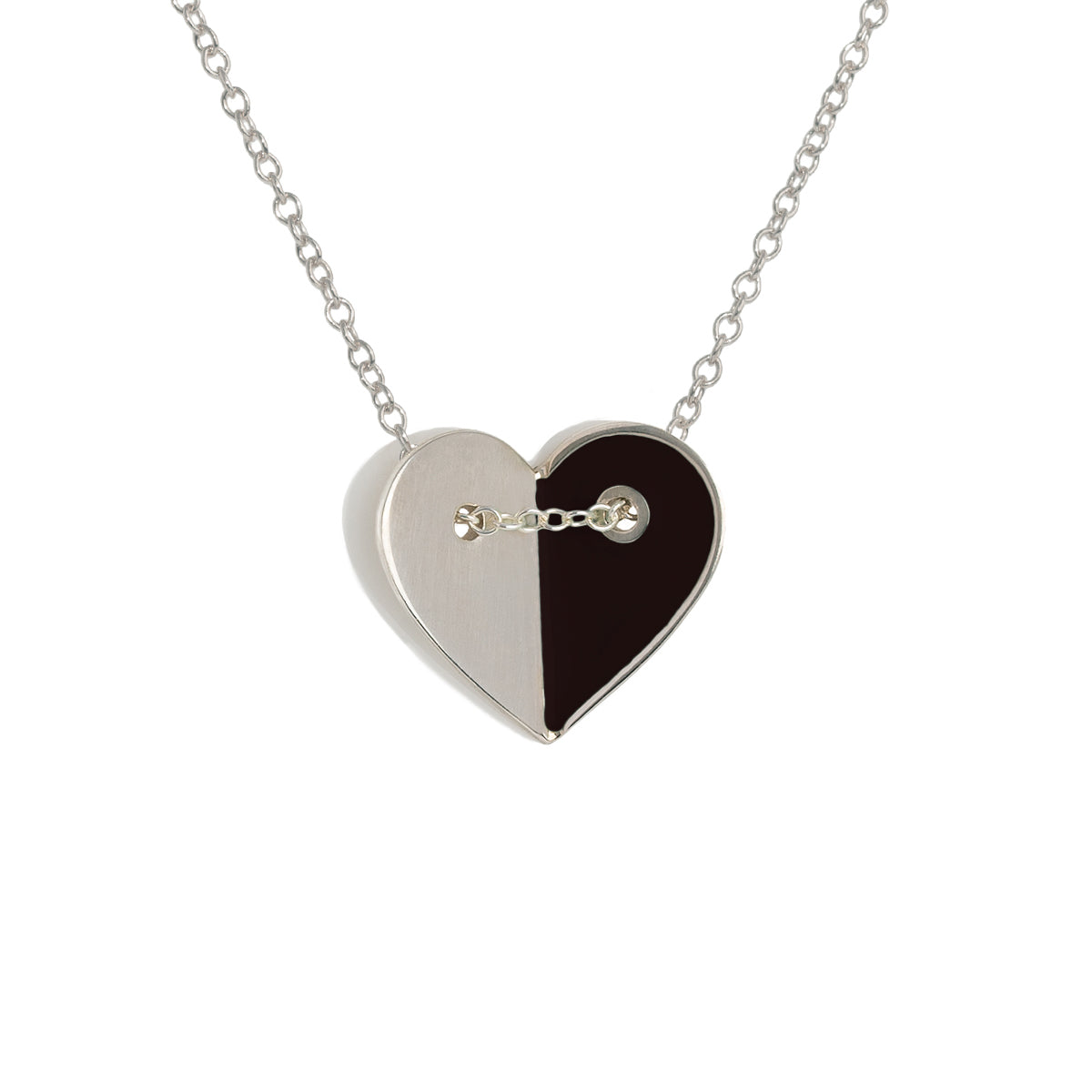 The silver happy heart necklace is joyfully fluttering around your neck showing off its two sides: one colorful, the other one shiny. Its two complimentary sides evoke the duality in each of us but also our choice to respond to life events in one way or the other. More commonly a split heart also represents you and your better half.