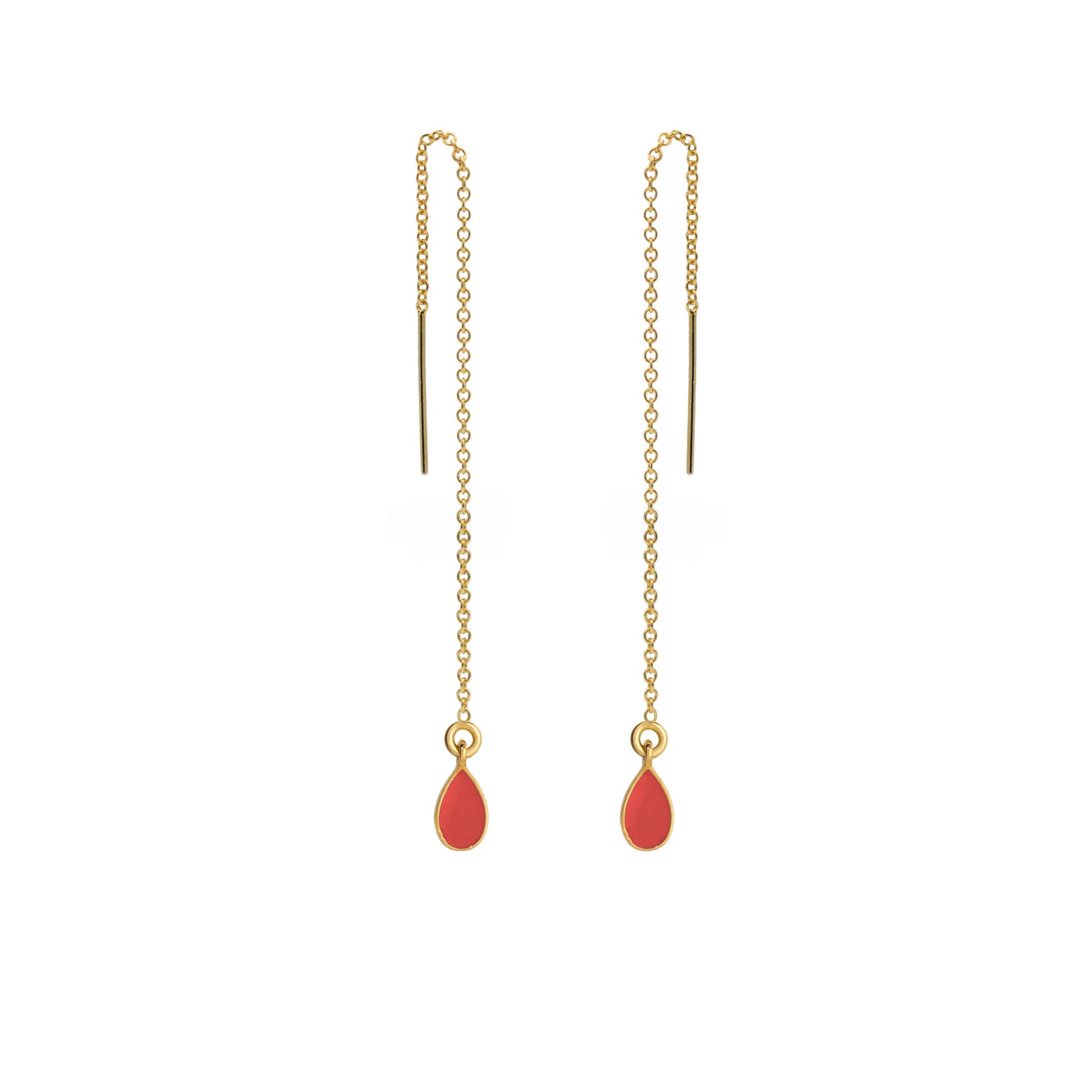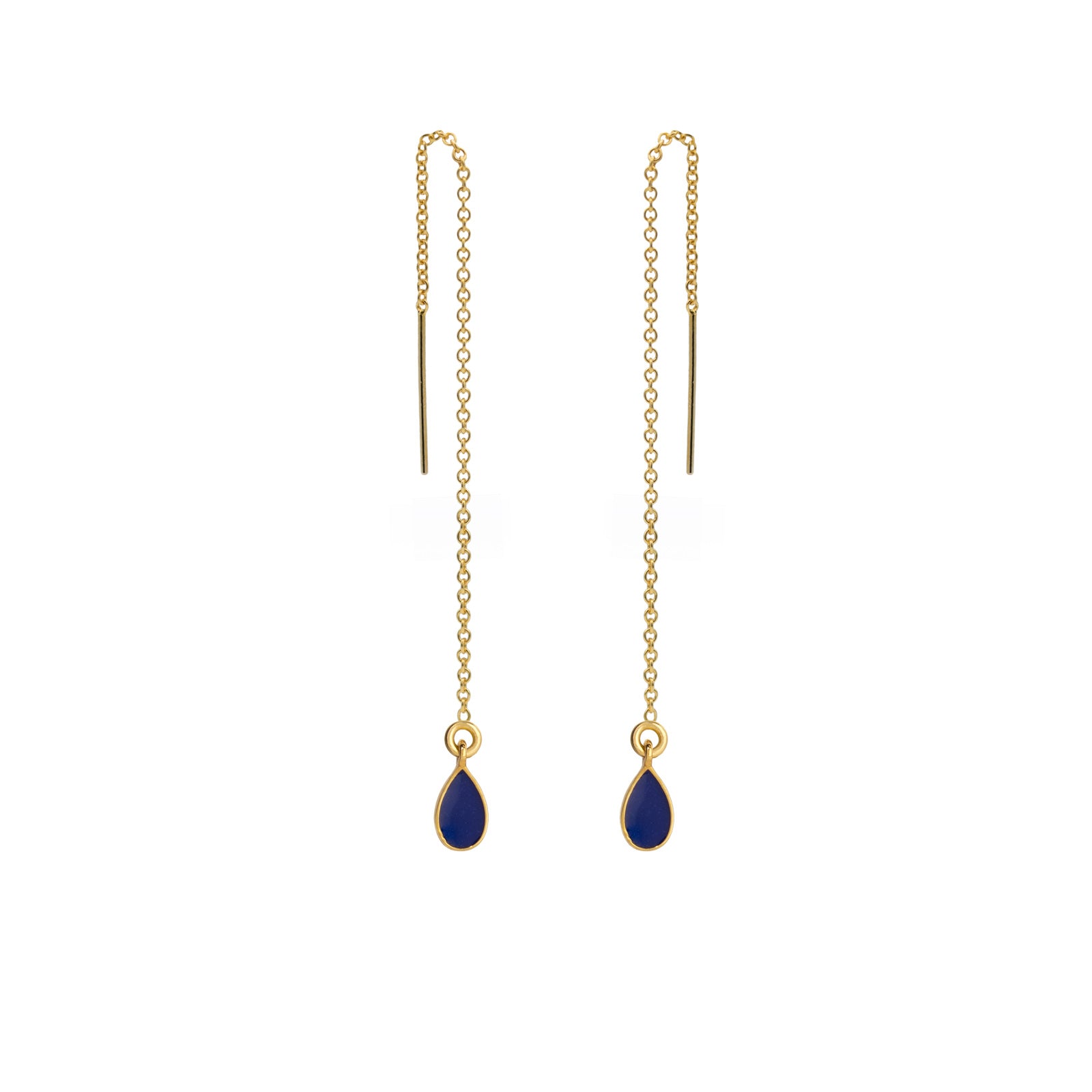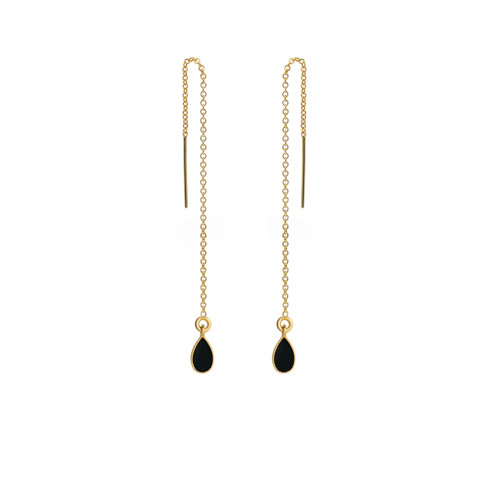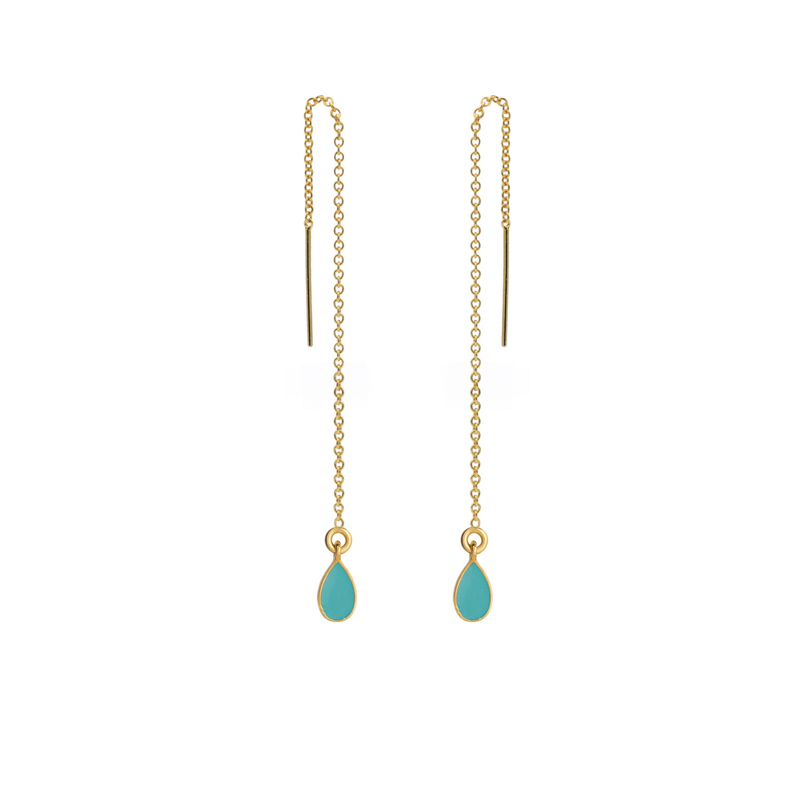 These ear threaders are beautiful and delicate, featuring a teardrop hanging by a chain. They are very versatile: you can change the height you wear them at by gently pulling the chain to the desired length. Or you can even thread them through piercings!