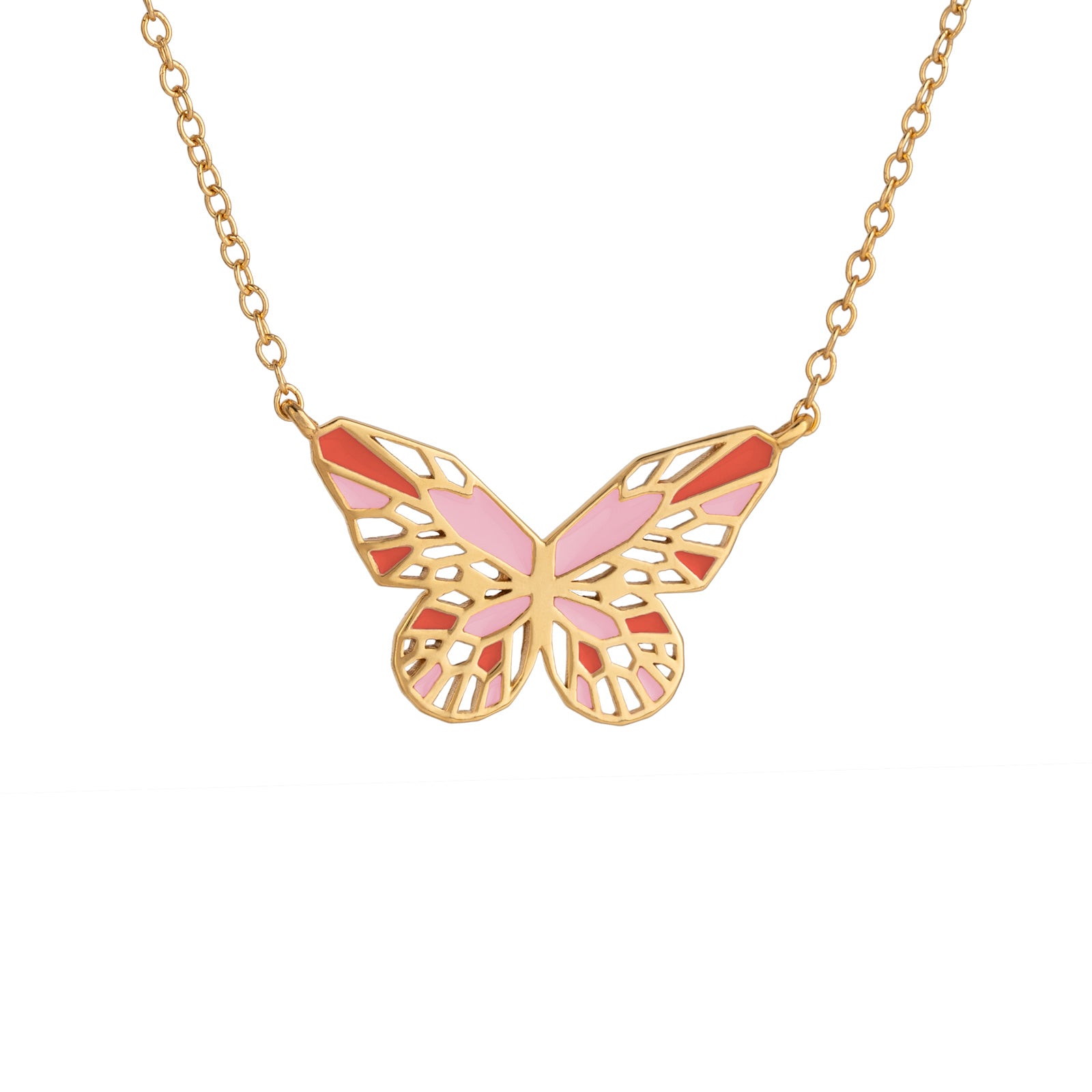 This butterfly necklace features intricate wings details hand decorated in coral and pastel pink enamel. It is feminine and delicate, ideal for everyday wear and for layering with other necklaces.