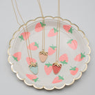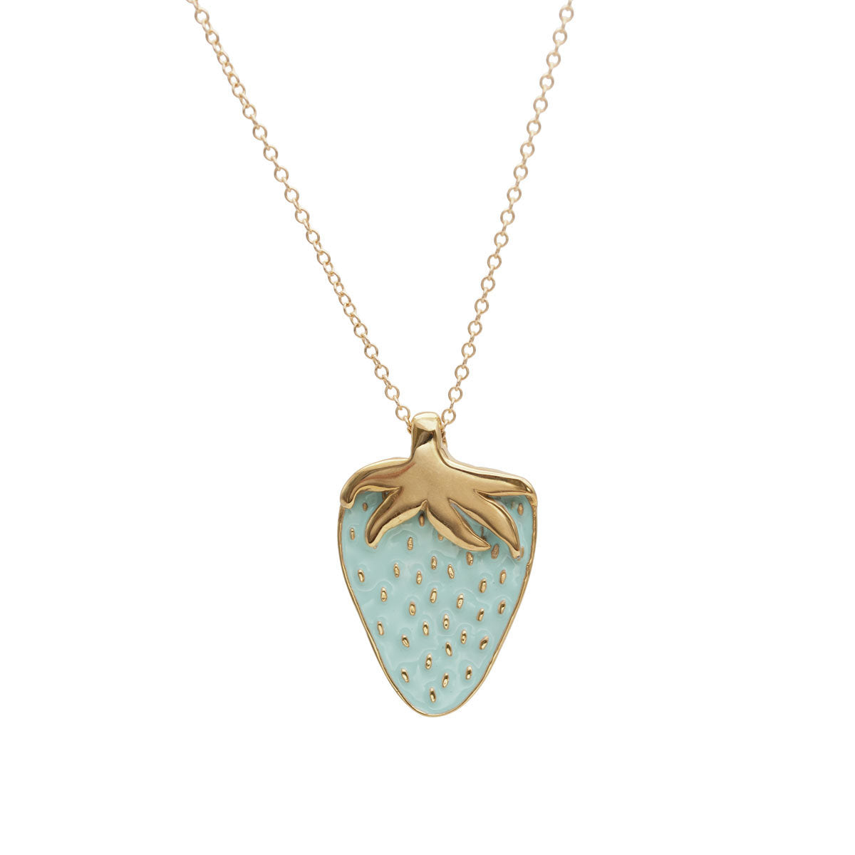 A juicy strawberry necklace, hand enameled in the color of your choice and dangling from a 14k gold filled chain.