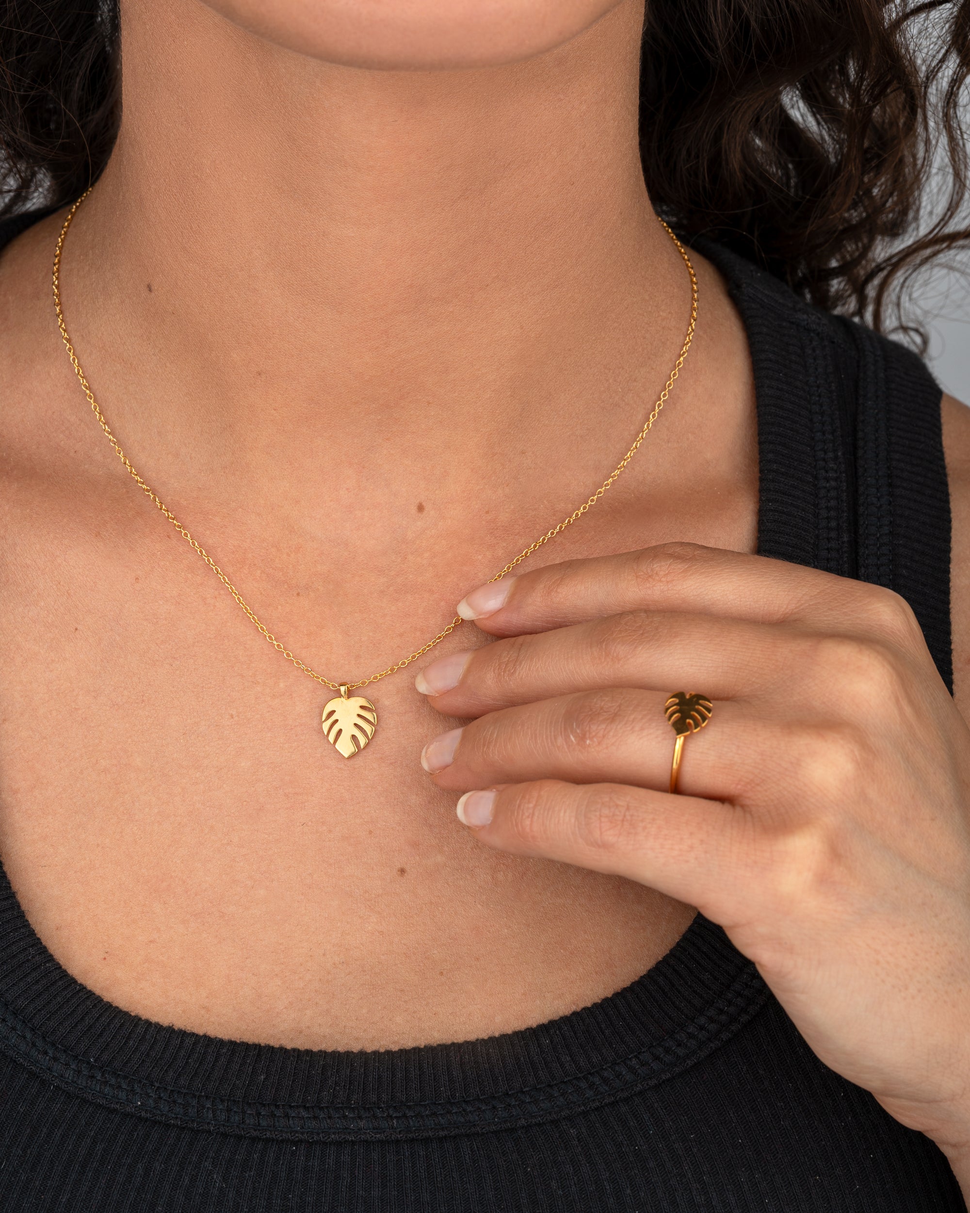 A dainty Monstera leaf necklace, easy to wear everyday to show off your green attitude. Who cares for a green thumb when you can have a green neck? This effortless necklace is an easy go to accessory that will do equally well on a simple shirt or an evening dress.