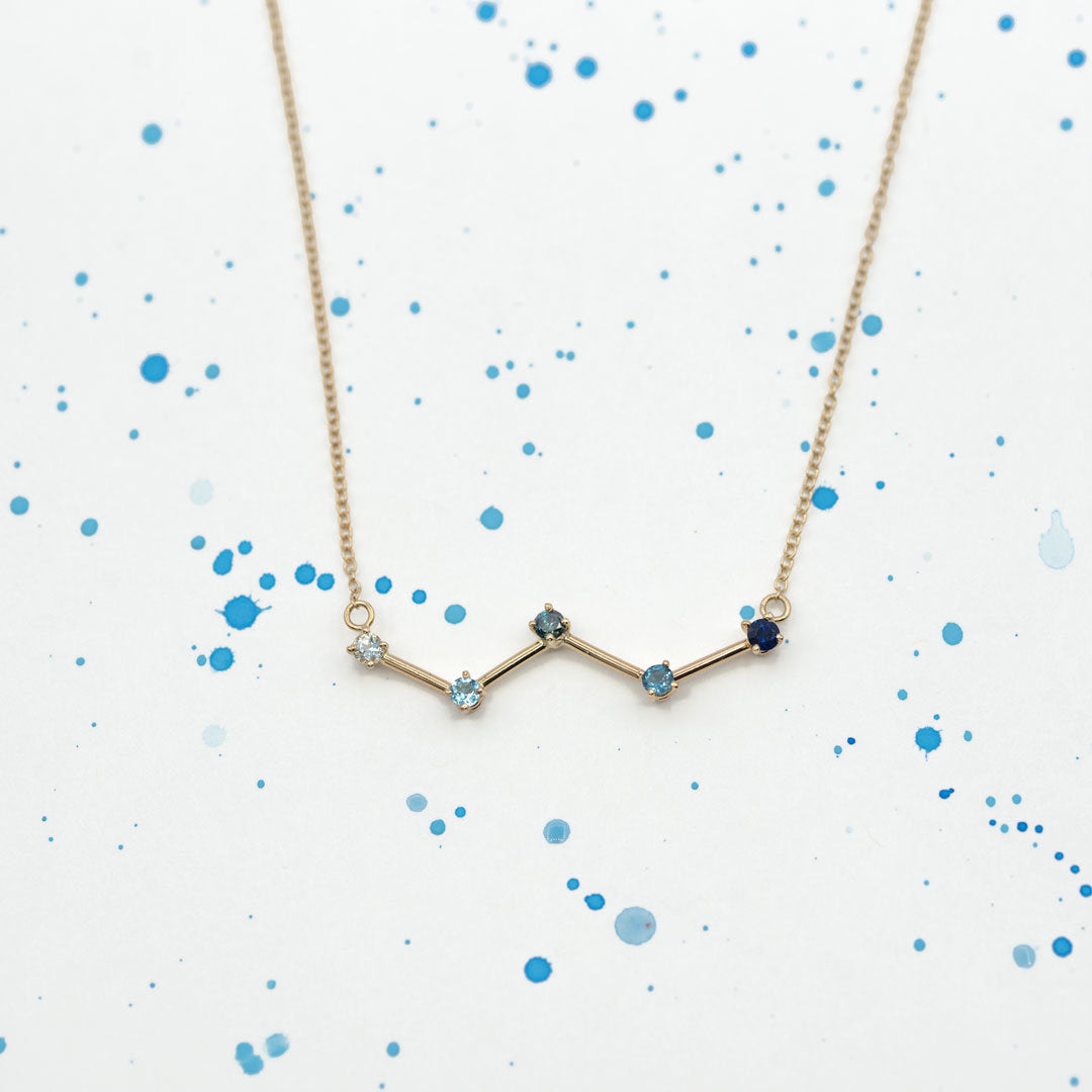 The Cassiopeia constellation has a recognizable "W" shape made up of five bright stars. The stars are represented in this necklace by 5 blue gemstones: an aquamarine, a light blue sapphire, a blue diamond, a London blue topaze and a deep blue sapphire. They are set in and connected with 14 karat gold sections. The constellation necklace is mounted on a 16 inches long 14k gold chain.