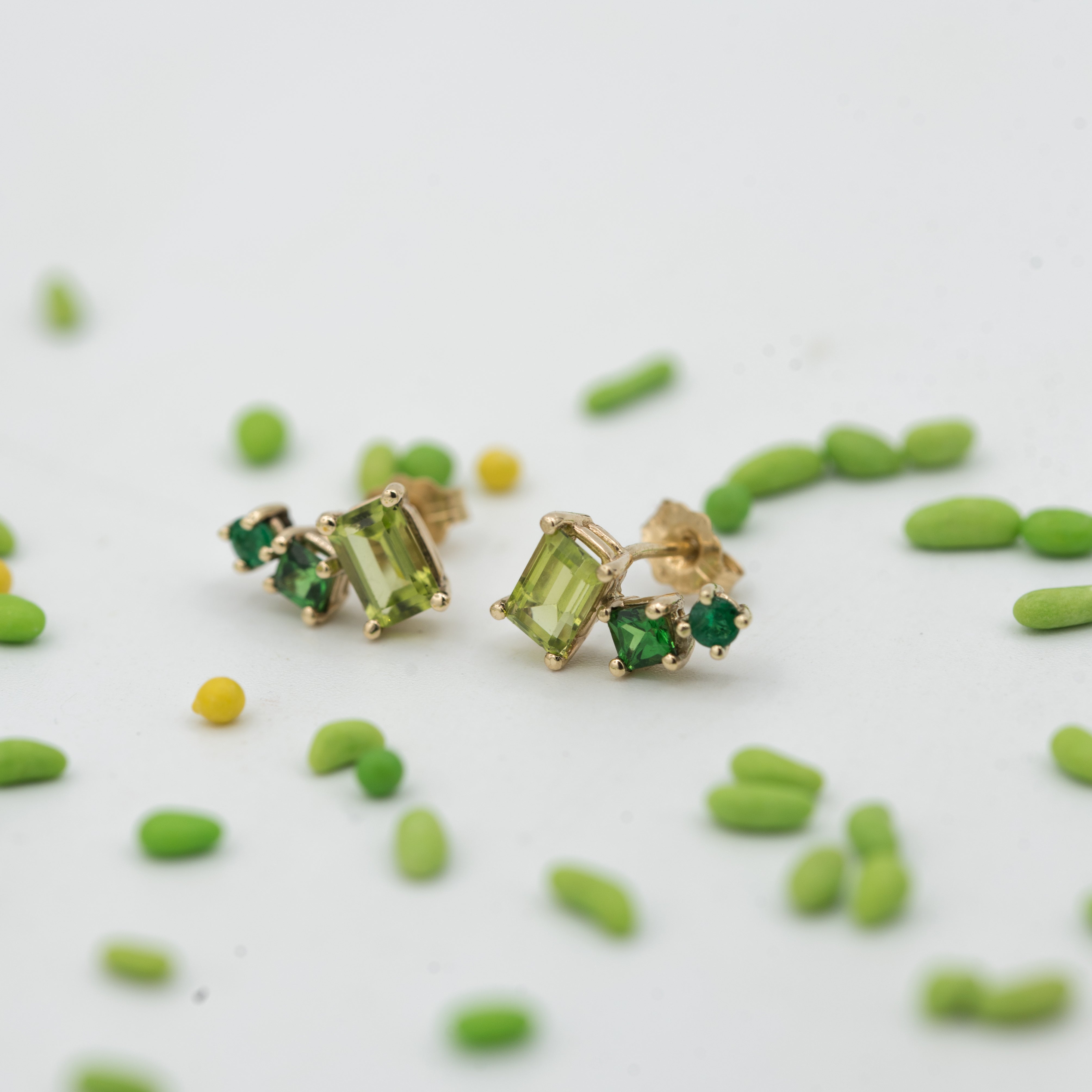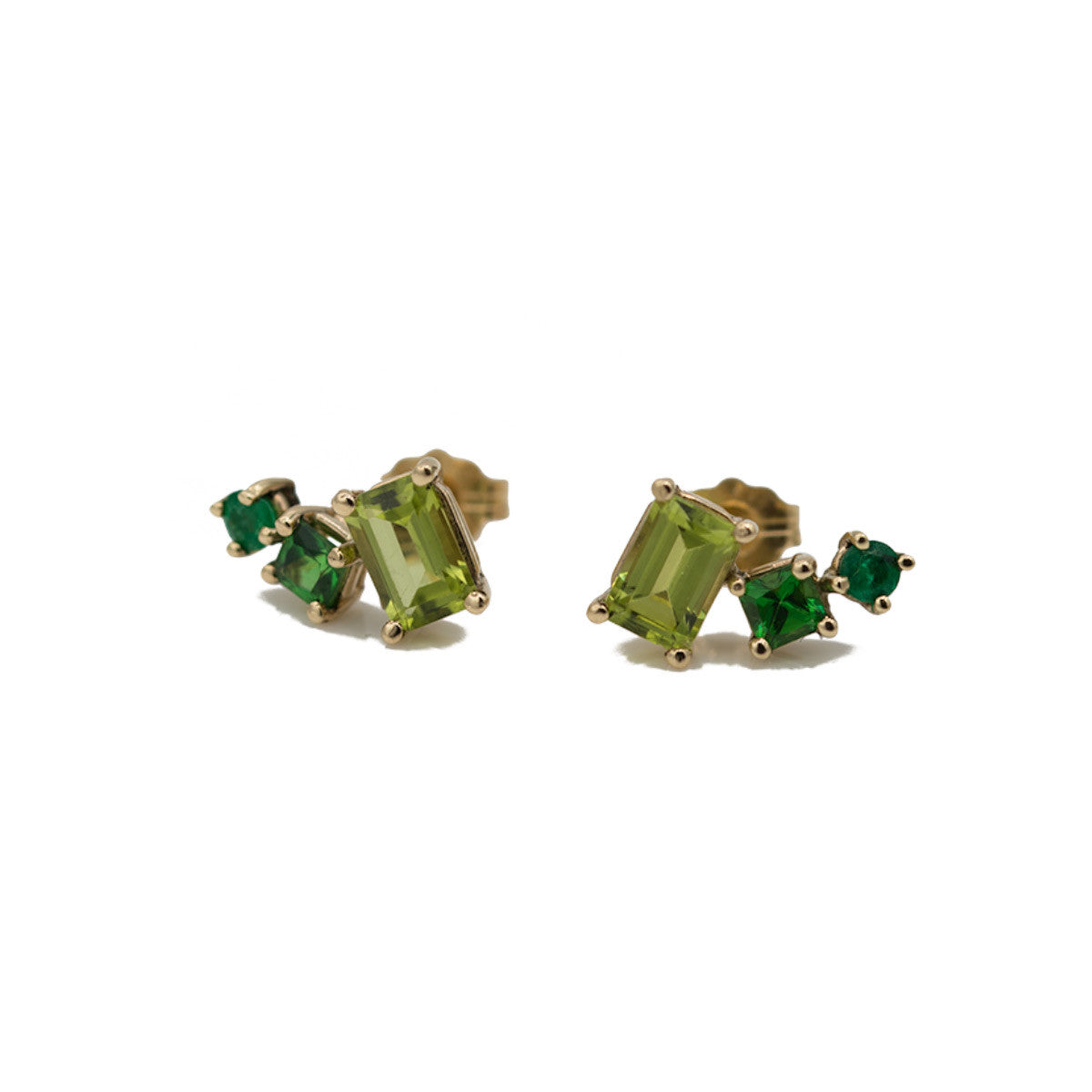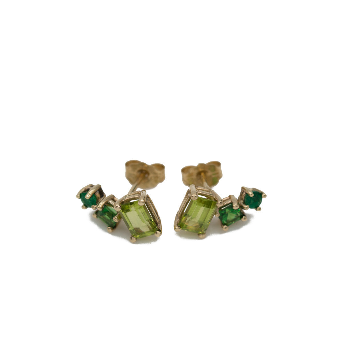 One of a kind pair of solid 14k gold earring studs featuring two 4x6mm Peridots, two 3x3mm Tsavorites and two emeralds of 2.5mm diameter each.