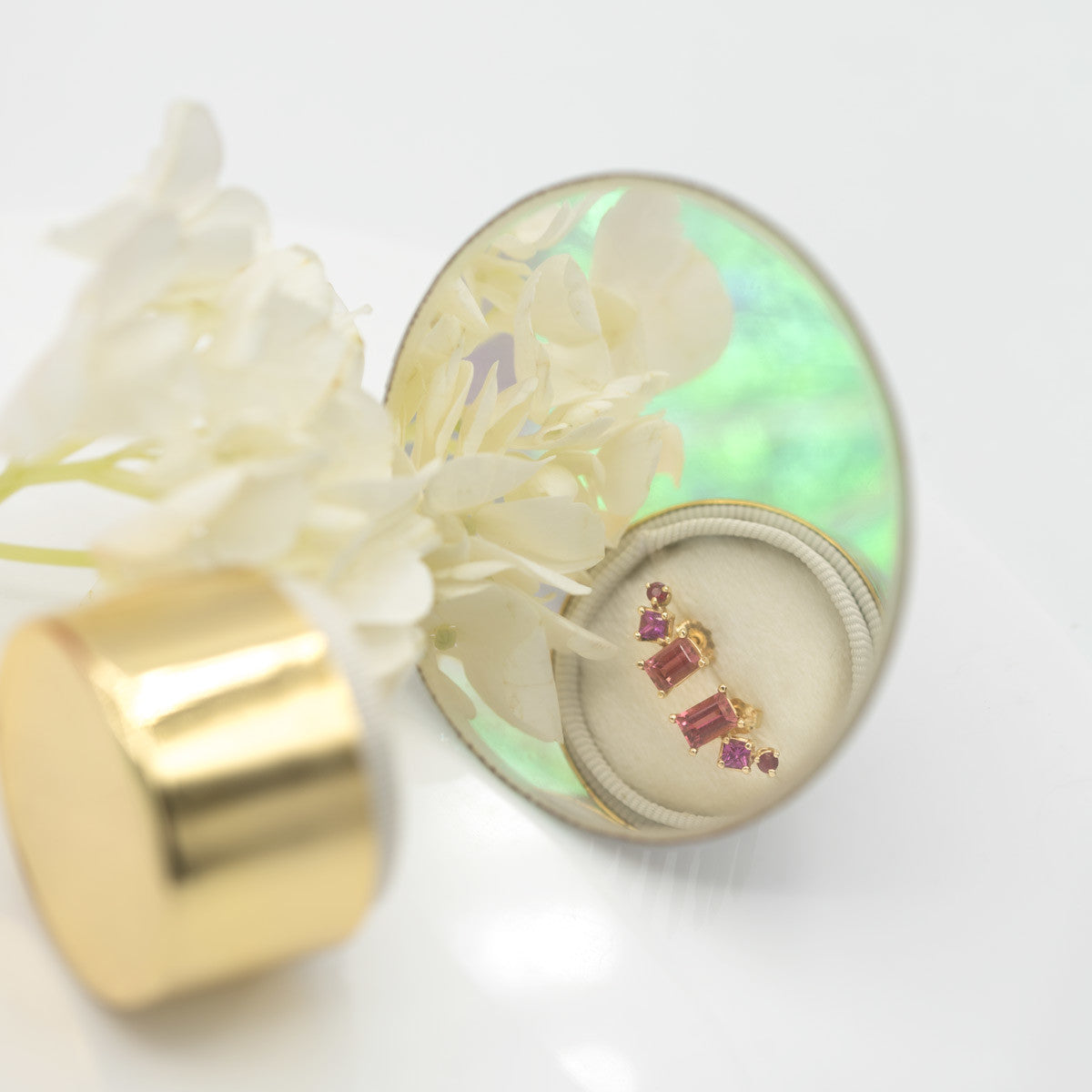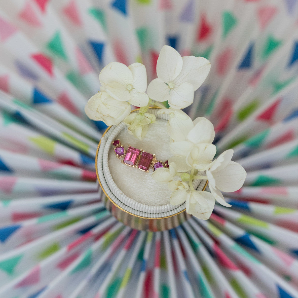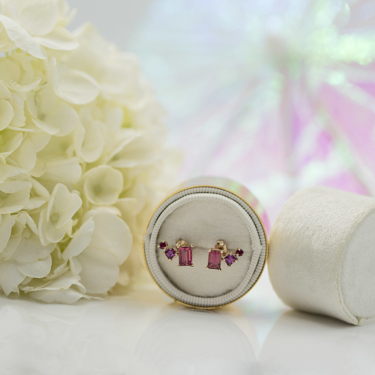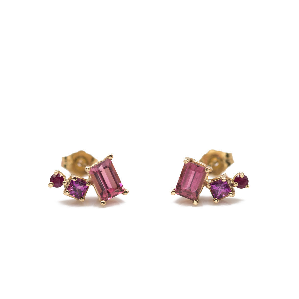 One of a kind pair of solid 14k gold earring studs featuring two 4x6mm pink tourmalines, two 3x3mm pink Ceylon sapphires and two rubies of 2.5mm diameter each.