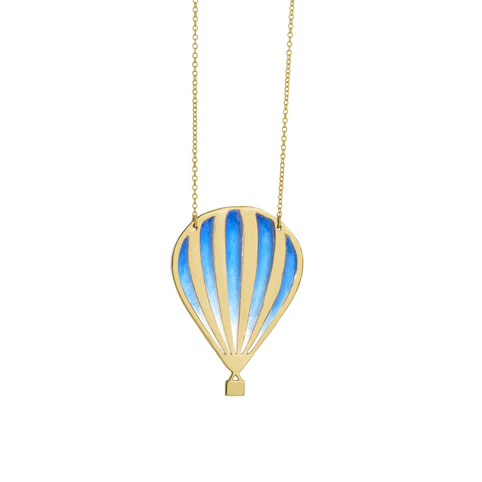 This gold ombre hot air balloon necklace will take you on a journey through blue skies and new horizons. It will make your spirits soar and will add cheerful gradient colors to your outfit. You can personalize your gold ombre hot air balloon necklace by selecting your favorite pigment color and I will decorate the envelope of the balloon with fading enamel from saturated to translucent. It is a unique see-through design similar to my multiglitter version.