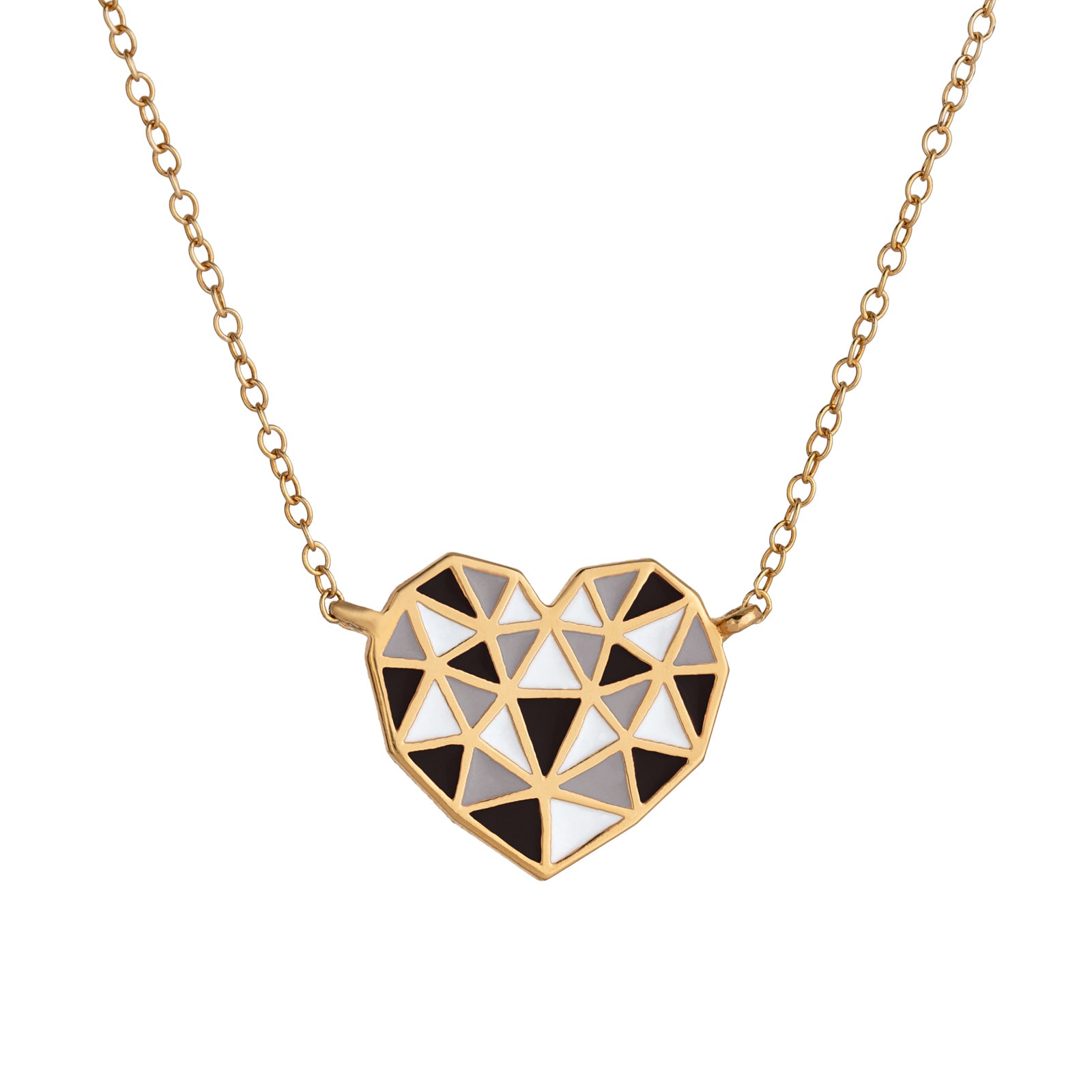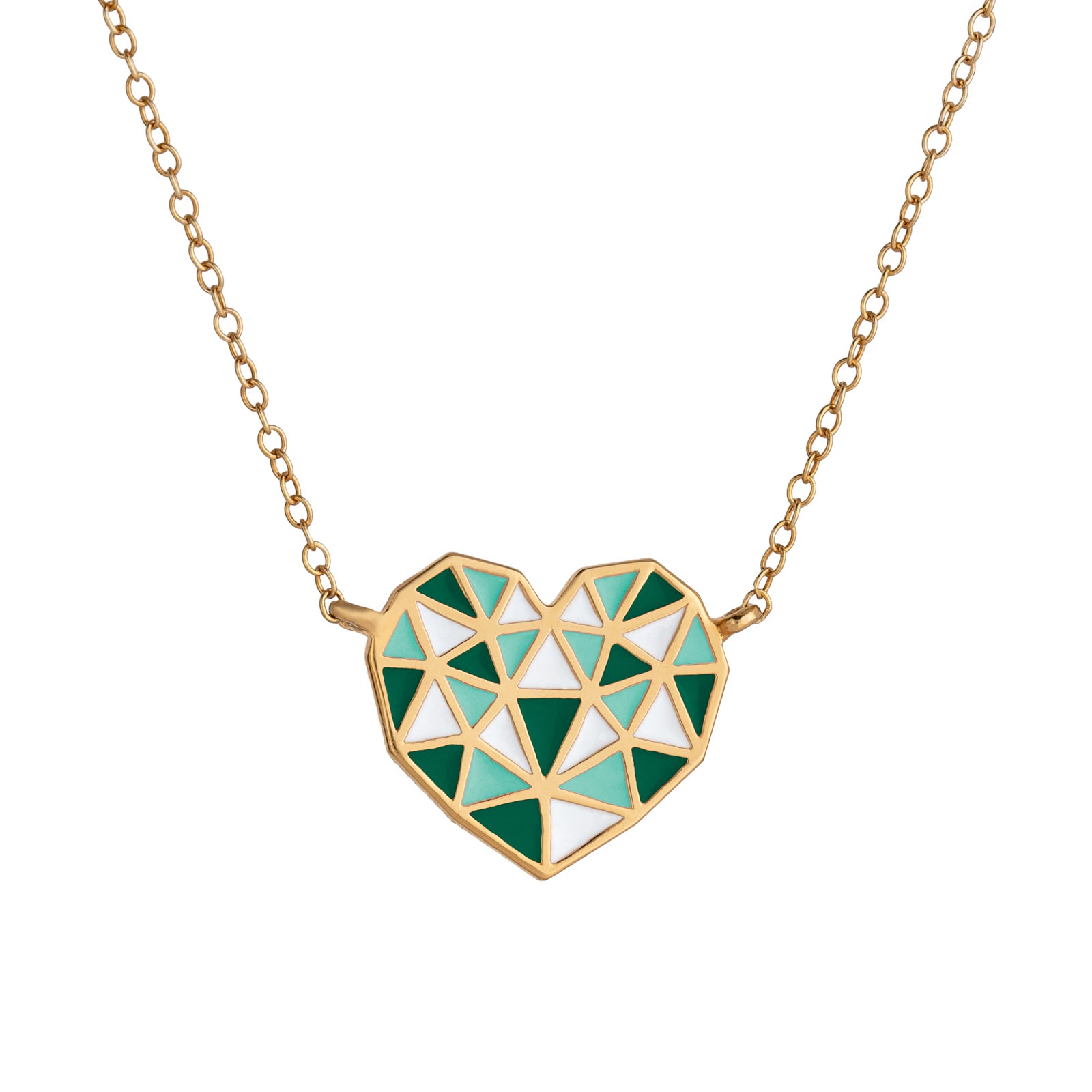 These heart necklaces are one of a kind, they are made up of a mosaic of connected triangles that represent all the pieces of your heart making it whole.