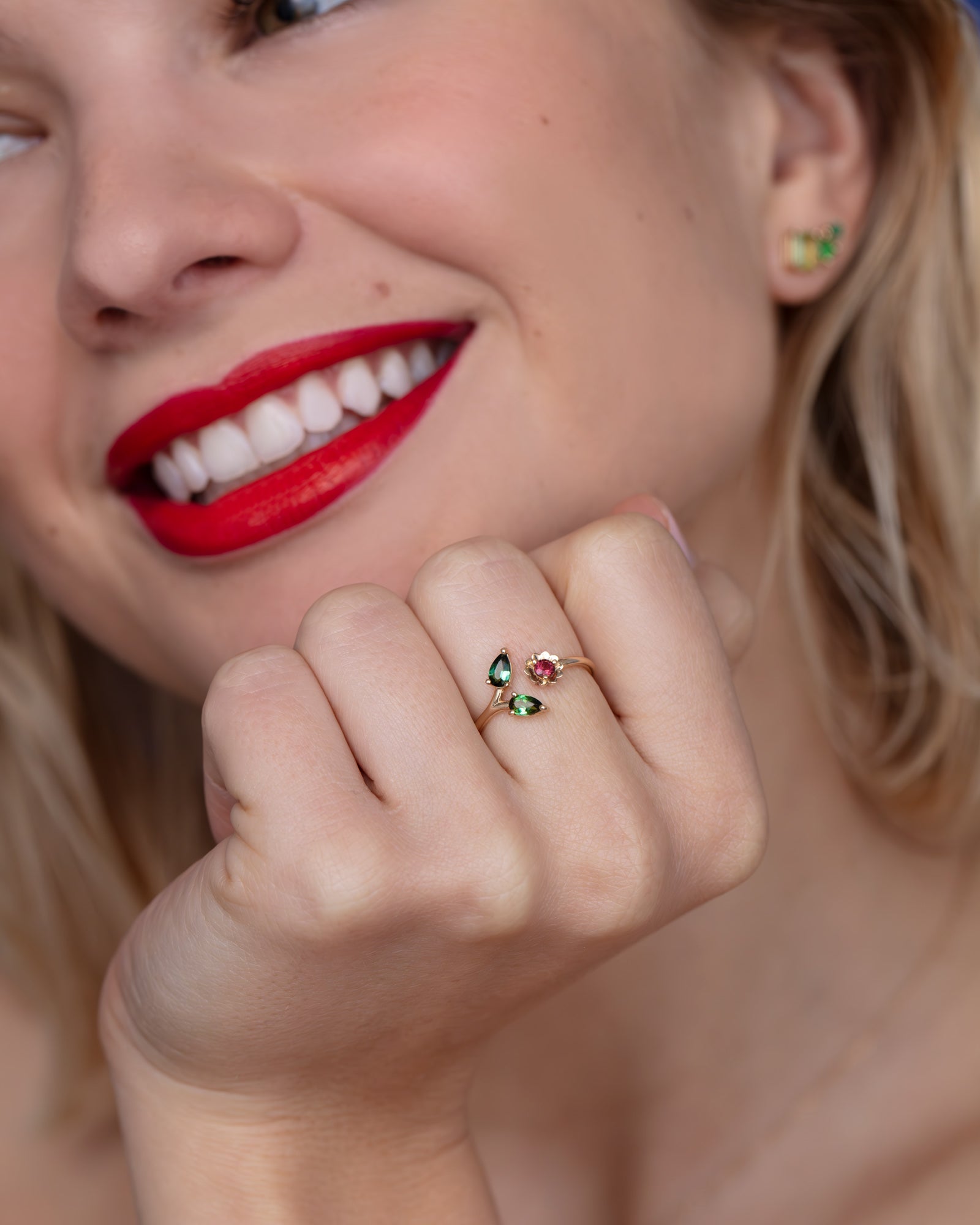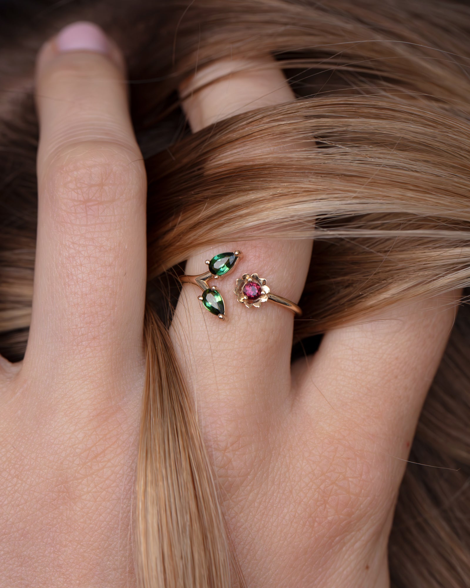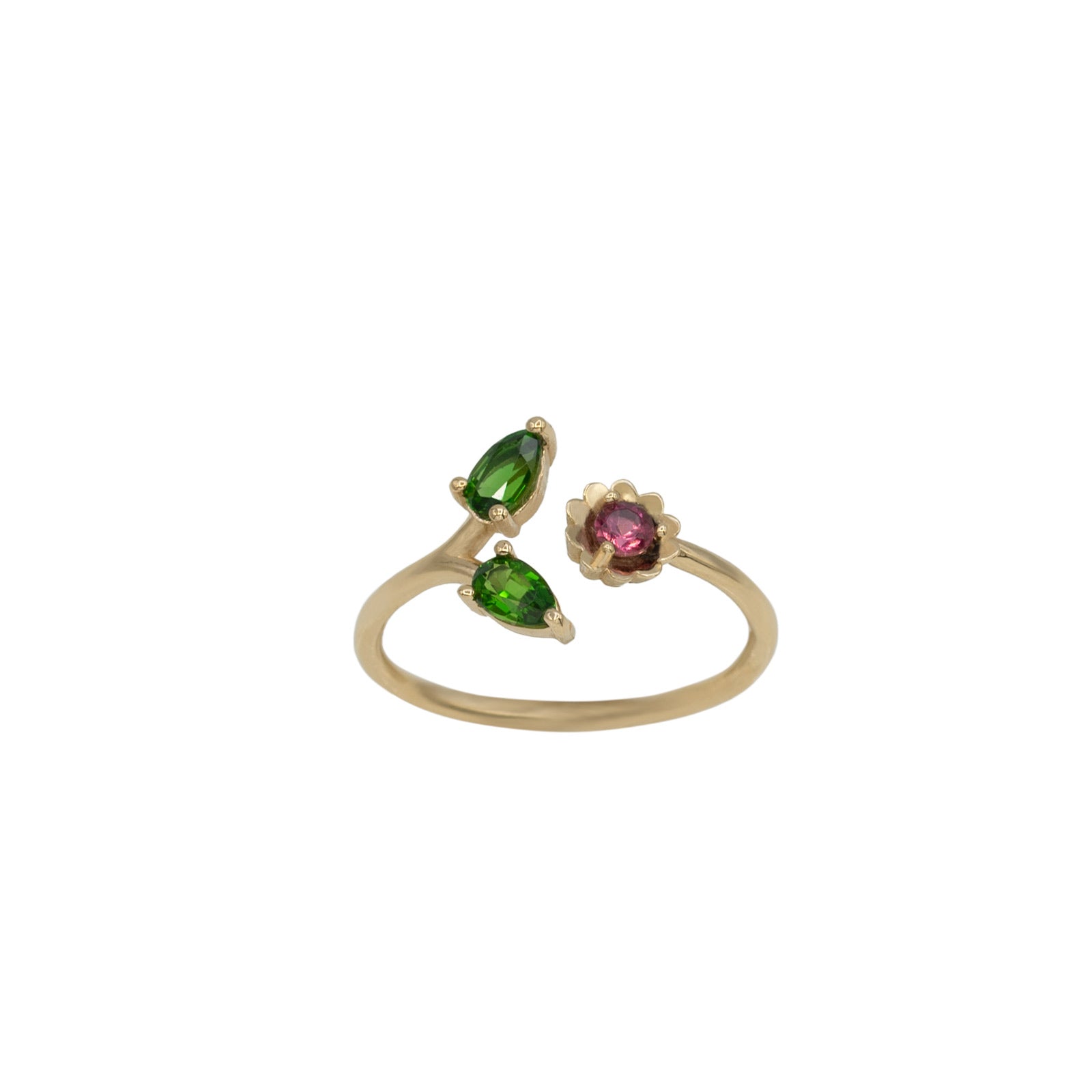 This open ring in solid 14k gold features 2 pear shaped green tourmalines figuring the leaves and a pink tourmaline representing the flower in bloom. It is slightly adjustable by gently opening or closing the open band and will work for an american finger size 6 to 7.