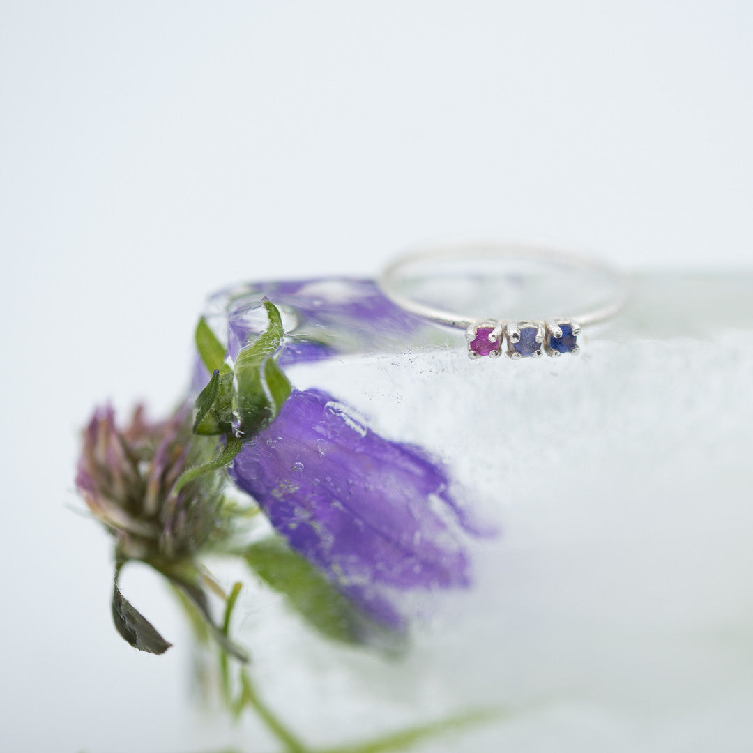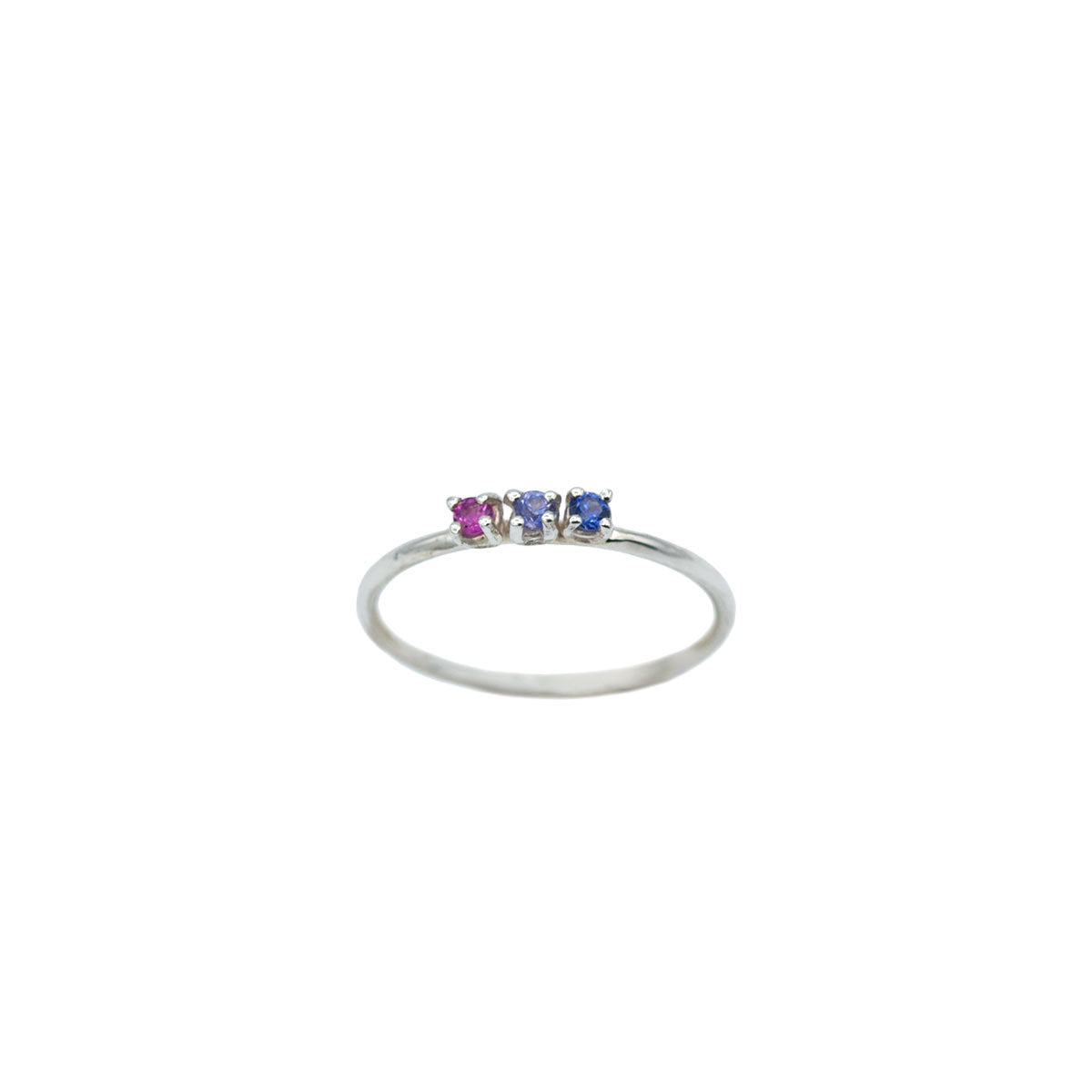 A precious purple ombre at your fingertips. This dainty rainbow ring features a vivid pink sapphire, a tanzanite and a deep blue sapphire. Each stone is about 2mm wide and set in sterling silver.