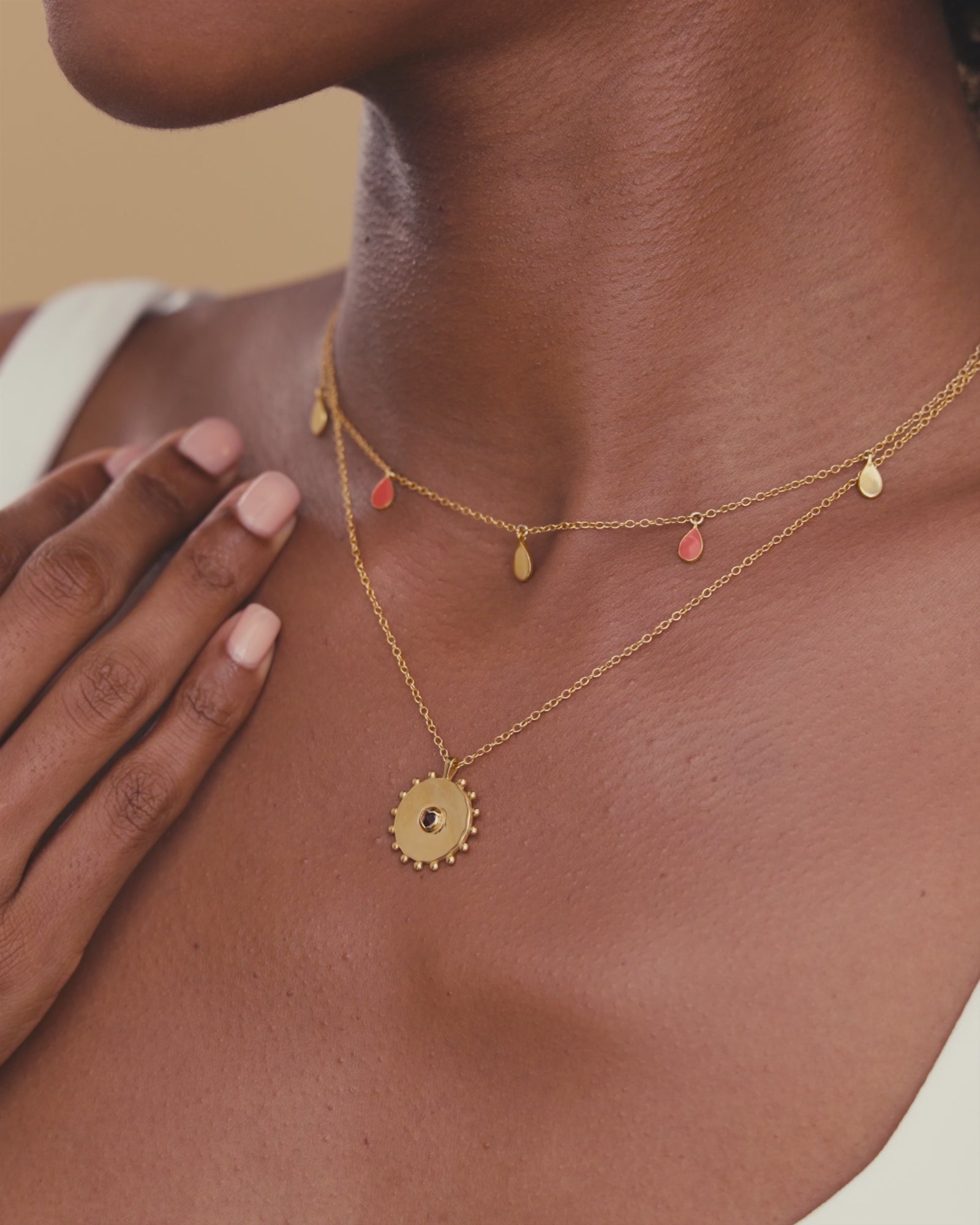 As portrayed on the model, the droplets necklace can be worn at a choker length and looks beautiful layered with the bursting love necklace.