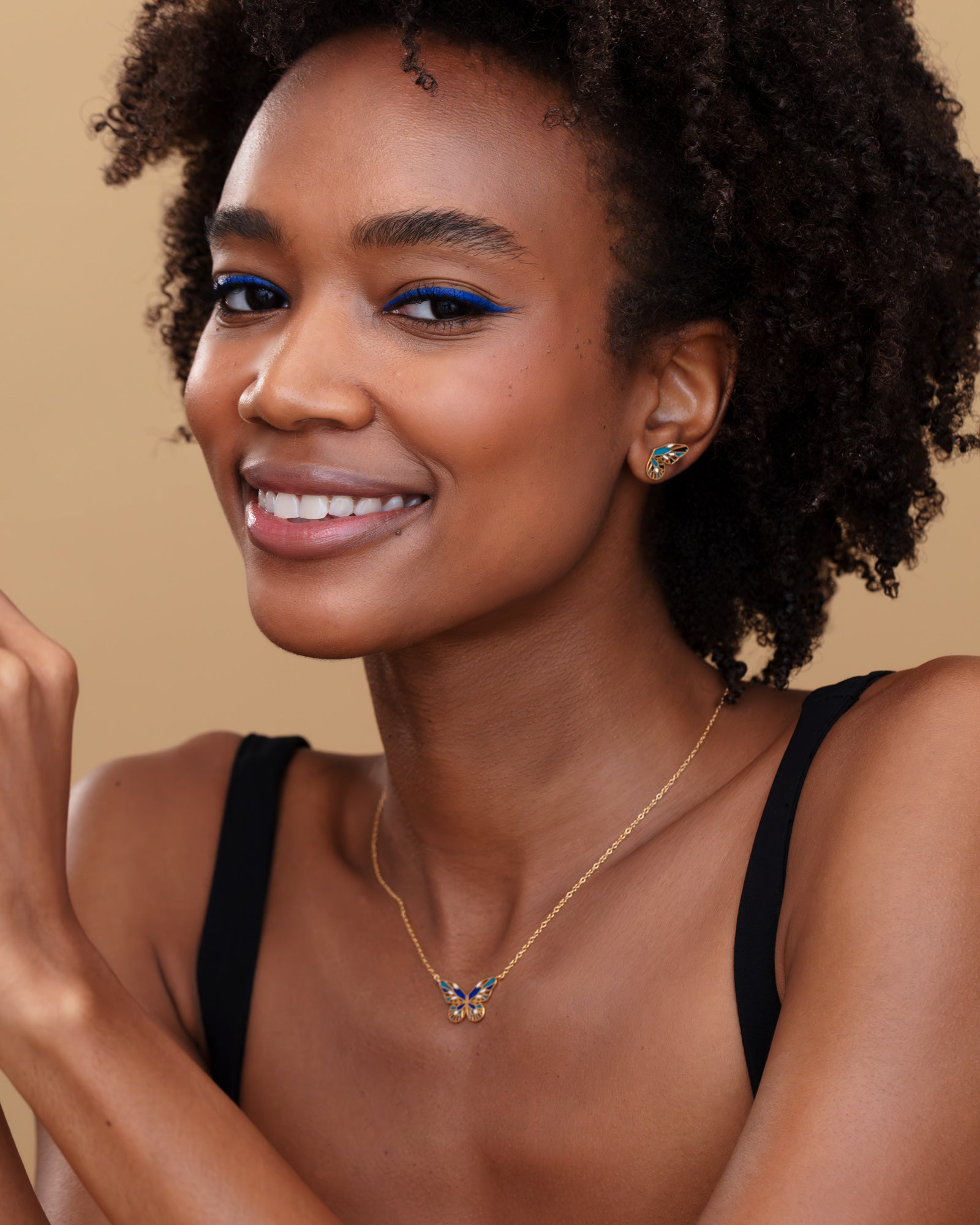 This butterfly necklace features intricate wings details hand decorated in mint aka pastel green enamel. They are very feminine and delicate, ideal for everyday wear and for layering with other necklaces.