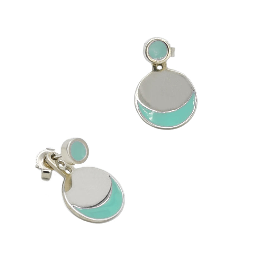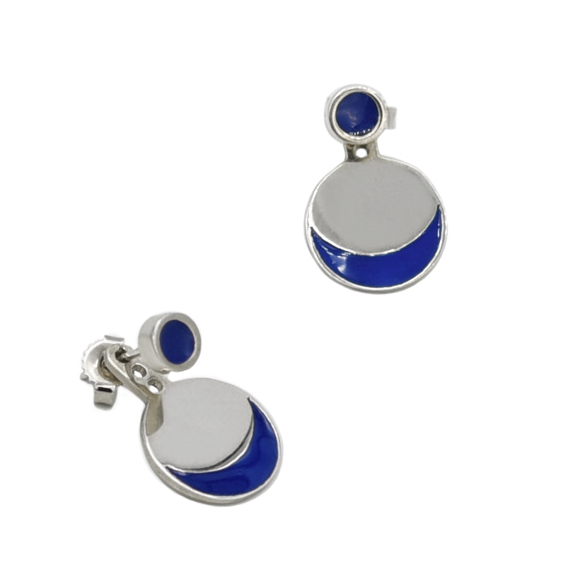 - with the enamel stud in front and plain metal side of the eclipse behind the lobe.